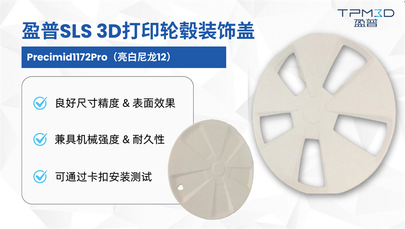 采用 Precimid1172Pro 亮白 PA12 材料打印的輪轂裝飾蓋,具備良好的尺寸精度和表面效果,兼具機械強度和耐久性,可通過卡扣安裝測試。同時,零件支持噴漆、電鍍等后處理工藝,能 1:1 模擬最終量產件的外觀效果,助力設計方案更快落地驗證。