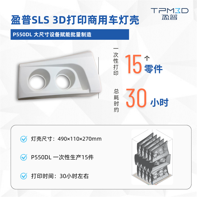 針對商用車燈殼的原型制造需求,盈普三維 P550DL 設備(成型缸尺寸 550×550×850mm)展現出強大的批量生產能力,一次性打印 15 件燈殼,僅需約 30 小時,相比傳統流程加工效率顯著提升。且采用的 Precimid1172Pro 白色尼龍 12 材料綜合性能優秀,滿足原型件的機械性能測試需求。