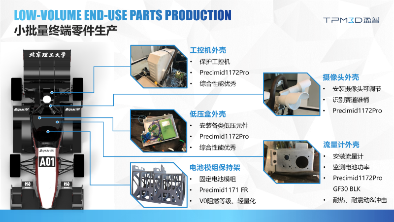 北理工大學生車隊自主設計制造的“灰鯊”系列賽車,分別獲得 2017 賽季、2018 賽季、2020 賽季全國總冠軍,是中國高校唯一的方程式賽事“三冠王”。其核心零件引入盈普 SLS 3D打印技術實現優化,生產零件包括工控機外殼、低壓盒外殼、攝像頭外殼、流量計外殼等,其中電池模組保持架的升級最為典型。傳統工藝采用玻纖板粘接,電池模組保持架單重 300g,且無阻燃性能。盈普 SLS 3D打印方案采用 Precimid1171 FR 阻燃尼龍材料,零件單重僅為 190g,整套框架減重 36.7%,且通過 UL94-V0 級防火認證,在賽車高強度運行中實現“輕量化 + 高安全”雙重突破,對電芯保護良好且精度高。