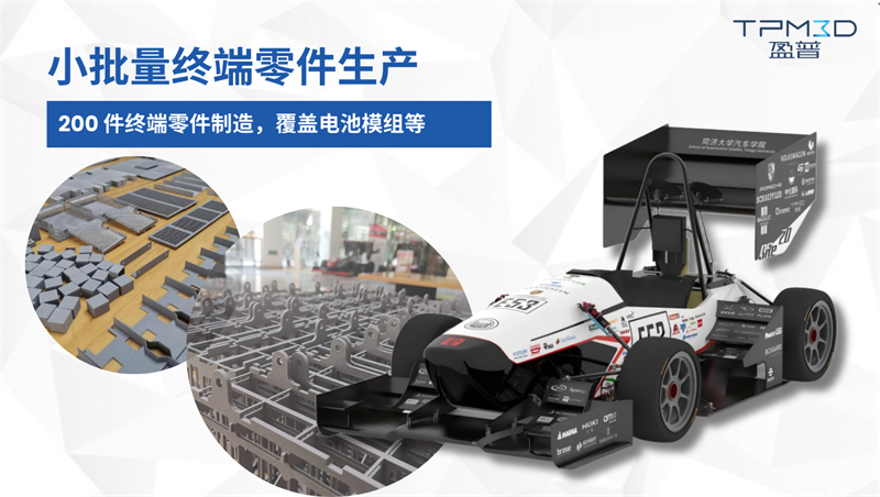 2020 年同濟大學賽車制作過程中,盈普共支持近 100 種 SLS 3D 打印件,打印零件數量多達 200 件,覆蓋電池模組、控制器支架、電池箱、電流傳感器、儀表盤、車身側翼、前翼、尾翼、電機水套、風道、后百葉窗、后風道及方向盤等類別。